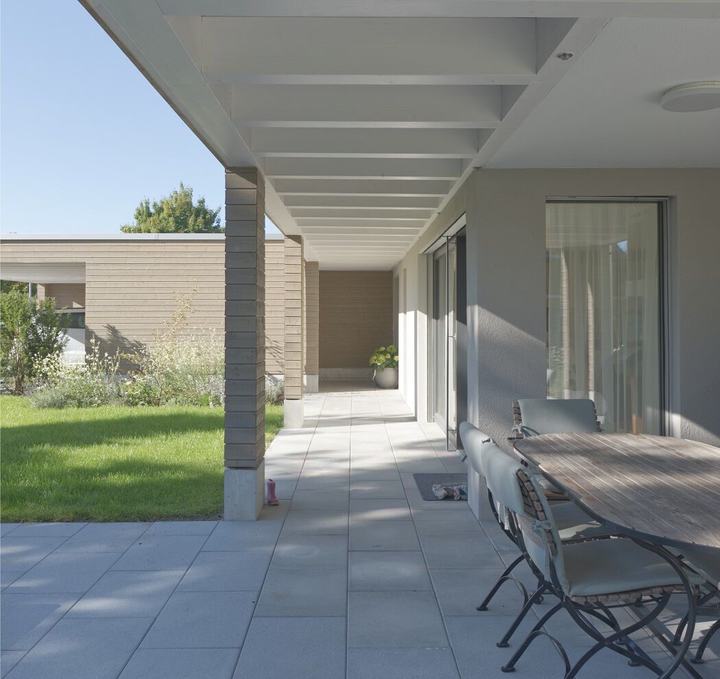 Die grosszügige Veranda ist das Verbindungsglied zwischen Garten und Innenraum, bietet aussen einen gedeckten Bereich entlang der ganzen Fassade und innen ein schönes Zusammenspiel von Licht und Schatten.
