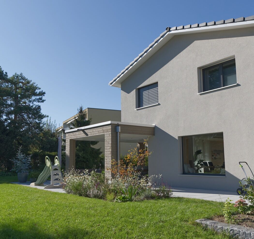Die grosse Fensterfront im Erdgeschoss öffnet sich zum Garten. Die Gartengestaltung nimmt Bezug zu den jeweiligen Ausrichtungen und bietet verschiedene Sitzgelegenheiten zum Verweilen an.