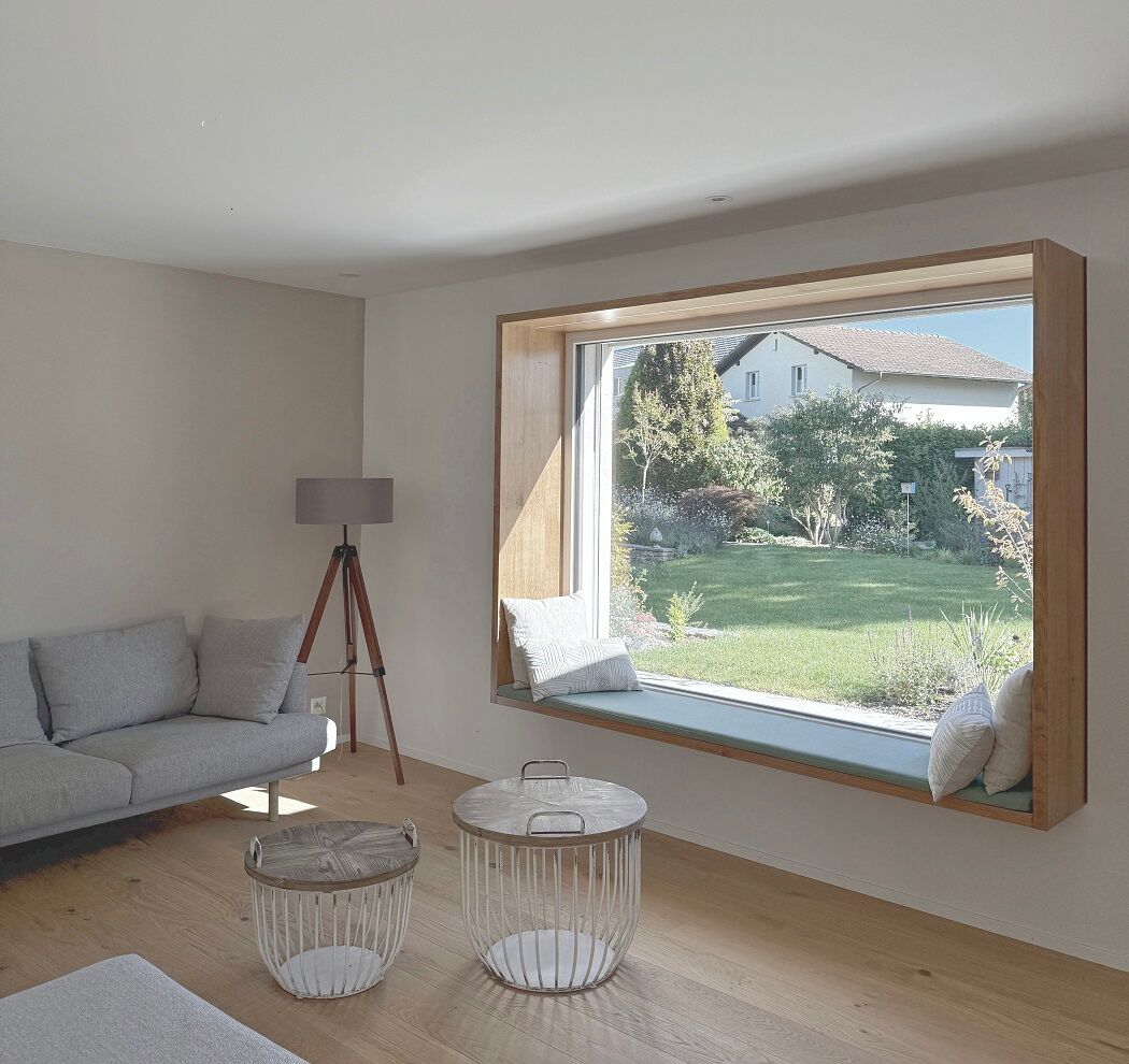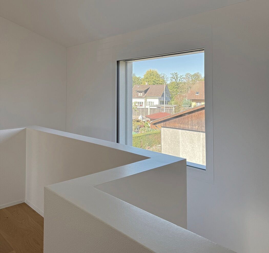 Grosse, gezielte Fensteröffnungen beim Eingang, beim Treppenhaus sowie im Wohn-/Essbereich schaffen spannende Blicke nach aussen. Das Quartier erhält durch den Neubau ein neues modernes Bild.